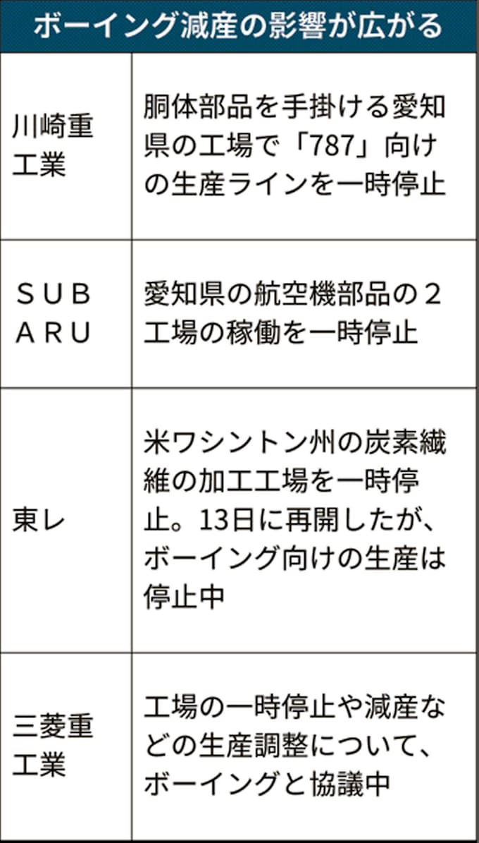 新型コロナ 航空部品 川重やスバルなど生産停止 ボーイング減産で 日本経済新聞