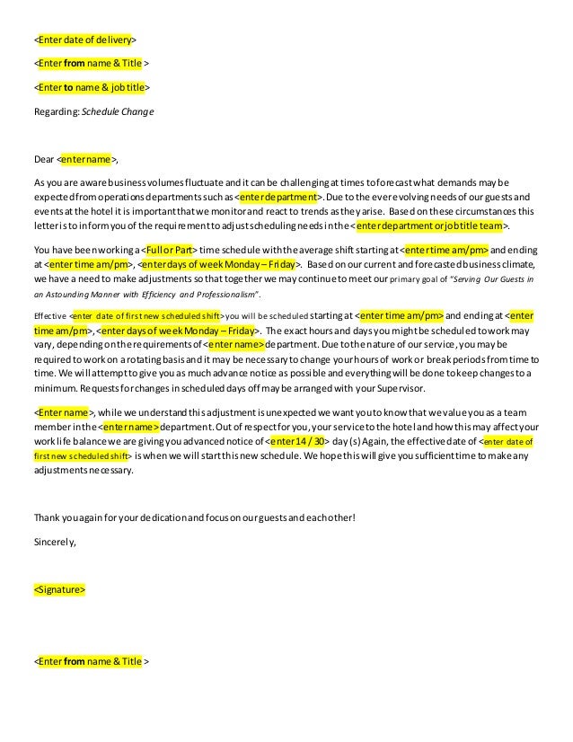A request for the change in the shift can be made By this, a worker can continue working at the same place without having bothered himself much Below is a sample letter that can be written to request a change in the shift schedule. Template letter to inform employee of schedule change with advanced notice Slideshare uses cookies to improve functionality and performance, and to provide you with relevant advertising If you continue browsing the site, you agree to the use of cookies on this website. Sample 1 – Shift Change Request Letter Employee’s Name City, State, Zip Code Employee’s Address DATE Employer’s Name Employer’s Address City, State, Zip Code Dear Employer’s Name I am writing this letter to request a change in my shift schedule My current shift is from 2pm – 10pm.